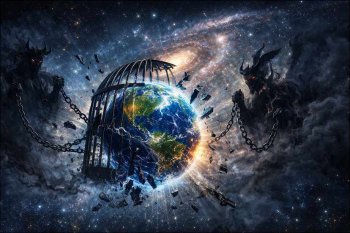 Zemlja v kletki se počasi osvobaja, okrog nje so demoni z verigami, ki izginjajo v dim.