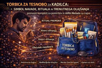 Simbolična »torbica za tesnobo« za kadilca odraža psihologijo, ki stoji za navado: potrebo po trenutku zase, vzorec dihanja, ki posnema pomiritvene tehnike, ter predmete, ki ustvarjajo občutek nadzora, ko so čustva premočna.
