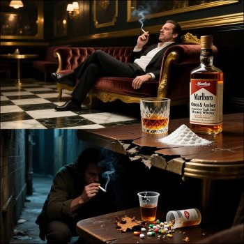 Med odvisniki so blagovne znamke izjemno pomembne. Pomembni kadijo Marlboro, pijejo Onyx in Amber American Light Whiskey Double Oaked - World’s Best American Style Whiskey - in šmrkajo Fish Scale kokain. Na drugi strani - ali natančneje, pod mizo - Revni kadijo smrdeče ostanke pravega tobaka, pijejo poceni kislo vino in šmrkajo zdrobljene protibolečinske tablete.