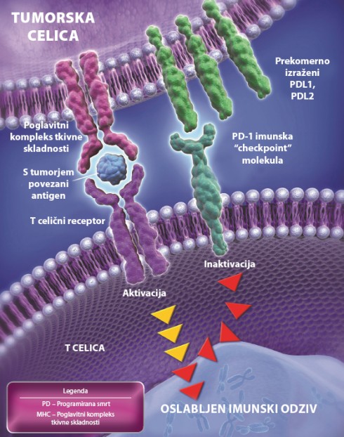 Pri regulaciji imunskega sistema obstaja več nadzornih točk, prek katerih lahko vplivamo na nadzorni sistem; eden izmed teh je receptor za programirano celično smrt PD-1. Receptor s T-celice komunicira z drugo celico (tudi rakasto) prek liganda, ki je v tem primeru PD-L 1 oz. PD-L 2. Prek nadzornega mesta PD-1 lahko tumor blokira imunski sistem, ki tako postane manj aktiven, in ne brani več pred rakavimi celicami. Zato so znastveniki začeli raziskovati, kako bi tumorskim celicam preprečili, da bi deaktivirale oziroma onesposobile imunski sistem in njegovo delovanje. To so dosegli tako, da so na receptor PD-1 vezali protitelo in tako preprečili, da bi se nanj oprijela tumorska vez (ligand). S tem je preprečena deaktivacija imunskega sistema.