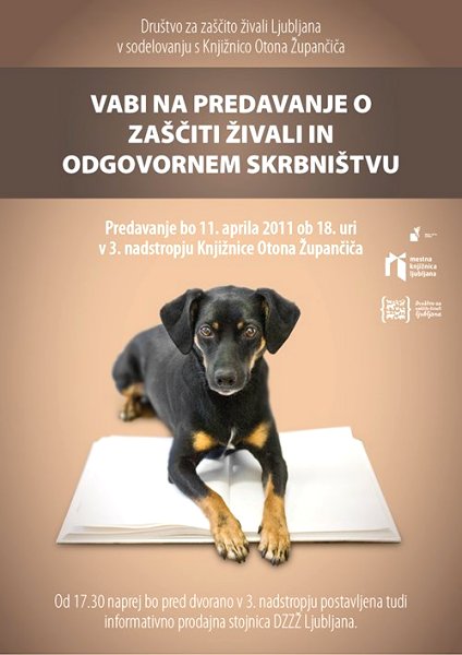 Osveščanje in izobraževanje o zaščiti živali je ena najpomembnejših dejavnosti društev, katerih cilj je zagotavljanje dobrobiti za živali. Društvo za zaščito živali Ljubljana se je zato odločilo izvesti cikel šestih tematskih predavanj na temo zaščite živali in odgovornega skrbništva, ki ga bodo prostovoljci izvedli v sodelovanju s Knjižnico Otona Župančiča (KOŽ). Prvega predavanja se lahko udeležite v ponedeljek, 11. 4. 2011, ob 18. uri v dvorani v 3. nadstropju KOŽ-a.