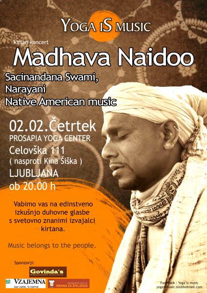 Madhava Naido prihaja iz Mavricijusa. On potuje po celem svetu, in je eden izmed najbolj avtentičnih izvajalcev kirtana. To je njegov drugi obisk v Ljubljani.