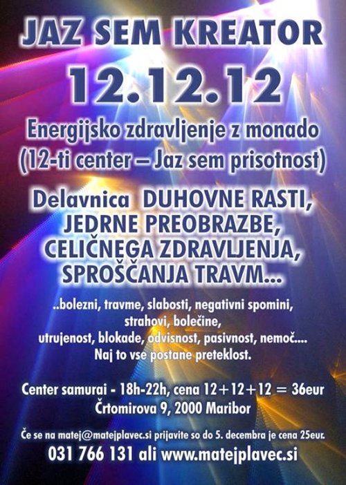 Spoštovani prijatelji, delavnico 12.12.12 osebno priporočam, saj imamo ponovno možnost ujeti energijski val, val vesolja, val in prisotnost ljudi, val nove zavesti, ki se vzpostavlja na Zemlji. Dan kot je ta, bo na milijone ljudi veliko bolj prisotnih, kot drugače, saj je to eden izmed trenutkov, ko smo ljudje na čisti sredini med starim in novim svetom, to pomeni, da bo frekvenca energije na Zemlji višja.