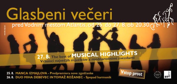 Glasbeni večeri pred Vodnim mestom Atlantis bodo potekali med 25. in 27. avgustom in sicer vsak večer ob 20.30 uri. Poleg Mance Izmajlove in dua Mihe Debevca in Tomaža Rožanca pripravljamo spektakularen šov THE BEST OF MUSICAL HIGHLIGHTS, ki bo z mednarodnimi zvezdami uprizoril največje uspešnice mjuziklov vseh časov.