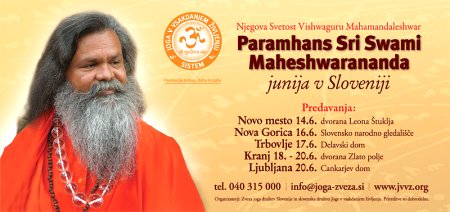 Zveza joga društev Slovenije in slovenska društva Joge v vsakdanjem življenju v juniju v Sloveniji ponovno gostijo priznanega ambasadorja miru in avtorja sistema 'Joga v vsakdanjem življenju' Nj. Sv. Vishwaguruja Mahamandaleshwarja Paramhansa Swamija Maheshwaranando.